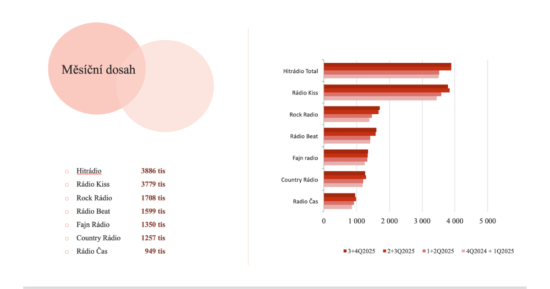 Síť Hitrádií potvrzuje svou pozici ve všech regionech (share 6,4 %). Měsíčně jej ladí více než 3,9 milionu posluchačů, představuje tak silnou kombinaci regionální relevance a celoplošného pokrytí. Hitrádia dlouhodobě oslovují zejména mladší a ekonomicky aktivní cílové skupiny a zůstávají klíčovou platformou pro efektivní zásah napříč ČR. Na začátku roku 2026 odstartovaly na celé sítí Hitrádií velké programové a marketingové změny s cílem neustále překvapovat své posluchače a také oslovit nové publikum, více k tomu dodává Michal Merenda, síťový programový ředitel Hitrádií: „Aktuálně jsme na Hitrádiích ve finále velkých programových i marketingových změn, kterými chceme podpořit naše regionální studia a dát jim novou perspektivu a velkou budoucnost. Před námi je ještě dost práce, nicméně to, že už třetí čtvrtletí v řadě roste naše měsíční i týdenní poslechovost, stejně jako celkový podíl na trhu, nás velmi příjemně motivuje. Na letošek chytáme pro naše fanoušky spoustu překvapení jak v éteru, tak na sociálních sítích. Moc se na ně těším.“
